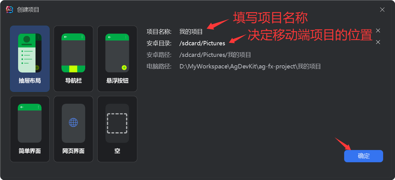选择项目模板,输入项目名称和安卓位置即可: