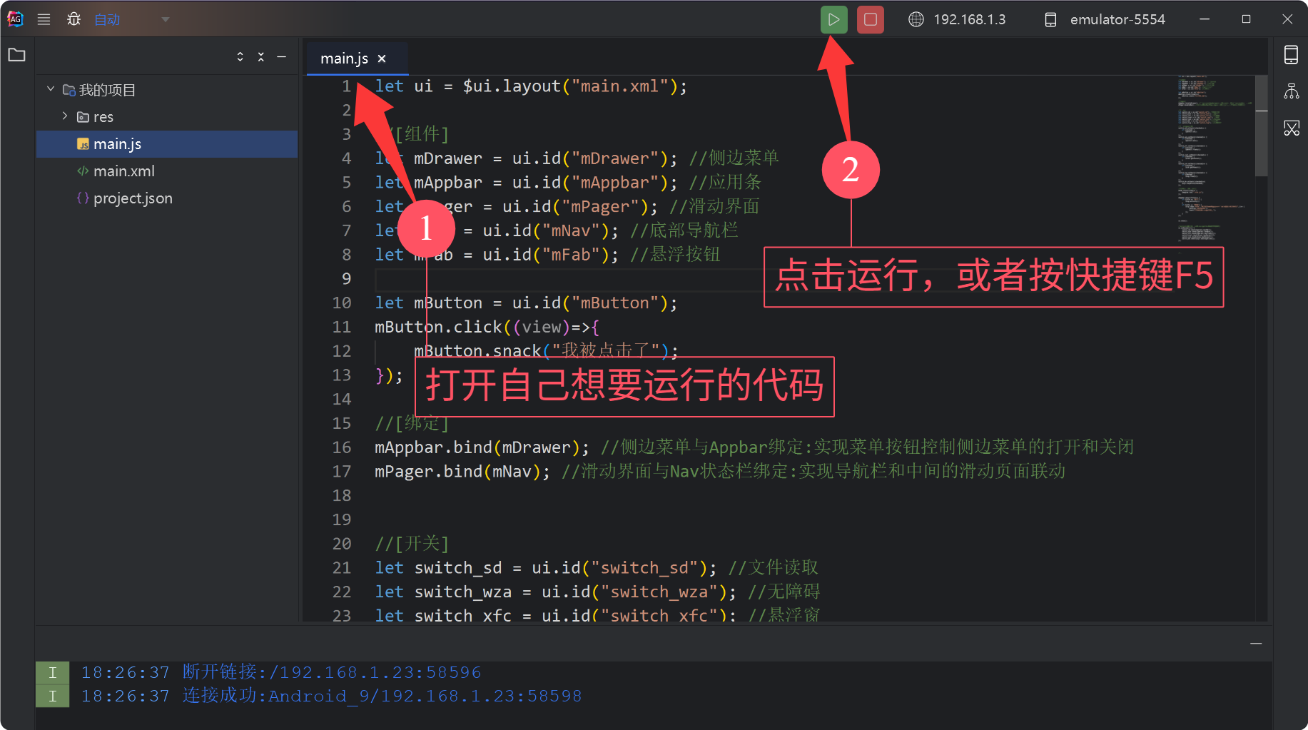 每次运行项目的时候,都会把整个项目都推送到安卓端,并且只会执行当前编辑器打开的脚本文件。